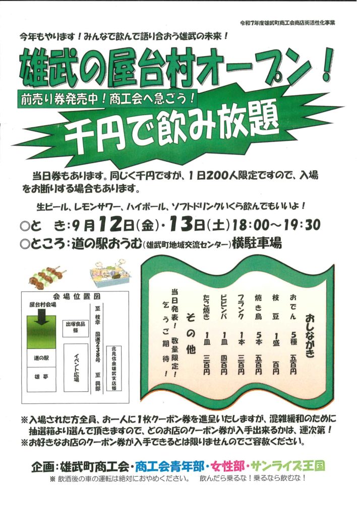 雄武の屋台村オープン! 投稿日: 2025-09-042025-09-04 投稿者: 菊地局員 前売り券 販売中! 9月12日(金)・13(土) 18:00〜19:30道の駅おうむ 横駐車場みなさまお越しをお待ちしています!